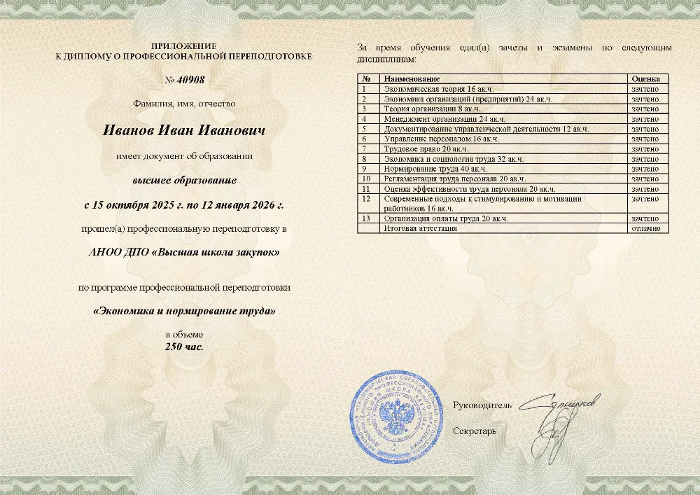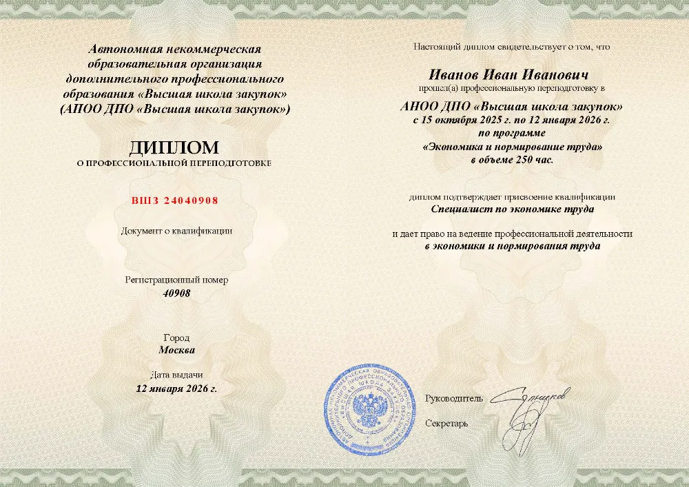 В «Дипломикс». Мы проанализировали цены на рынке и убедились: наша программа профессиональной переподготовки по экономике и нормированию труда предлагается по самой низкой стоимости. Объем — 250 часов, по завершении выдается диплом с официальным внесением в ФРДО.