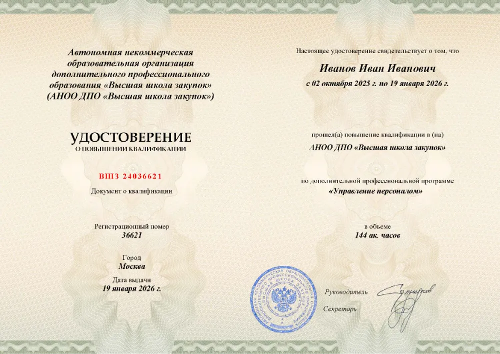 В «Дипломикс». Мониторинг рынка подтверждает: наш курс — самый дешевый среди учебных центров, реализующих повышение квалификации по управлению персоналом. Полный объём — 144 академических часа. Вы получаете официальное удостоверение с внесением сведений в ФРДО.