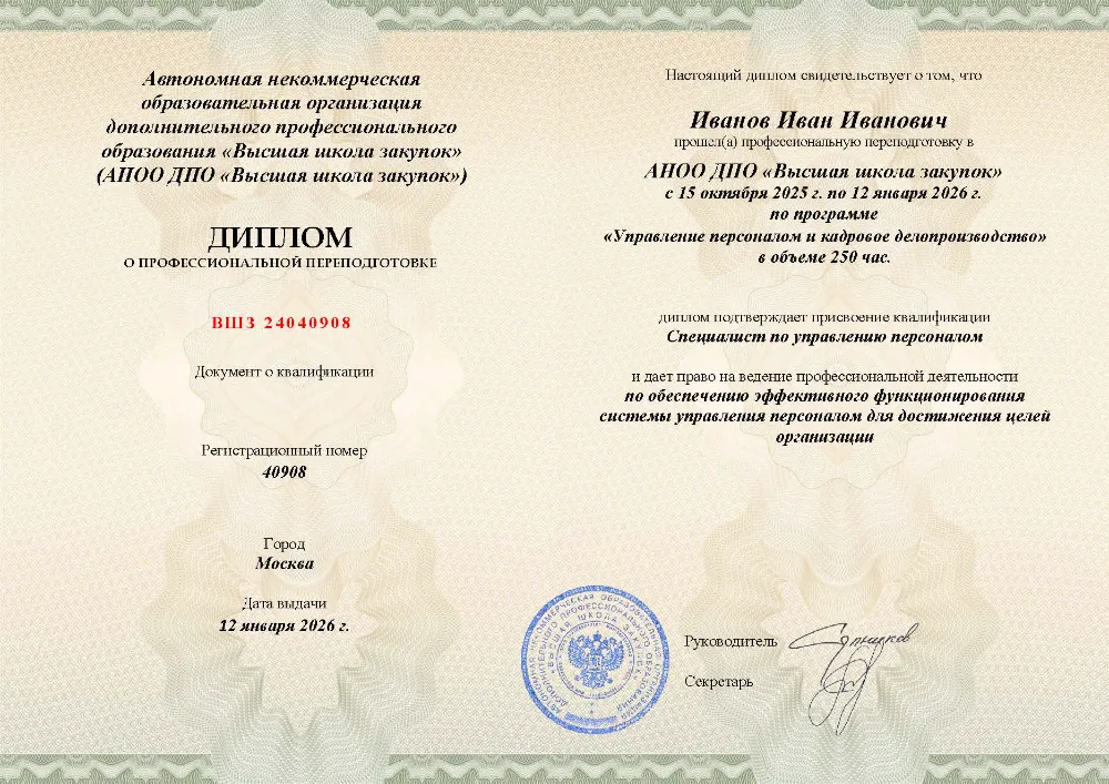 Программа профессиональной переподготовки (250 академических часов) охватывает полный цикл кадрового делопроизводства: основы административного права, документирование трудовых отношений, ведение трудовых книжек, работа с персональными данными и личными делами сотрудников. Дистанционный формат доступен в Белгороде и другим регионам. Итоговая аттестация — лёгкий тест до 10 вопросов без ограничения времени и числа попыток (99% сдают с первого раза). Рефератов и дипломных работ нет. Диплом выдаётся за 1 день, данные вносятся в ФРДО в день выдачи. По результатам мониторинга рынка — это самый дешёвый курс среди аналогов.