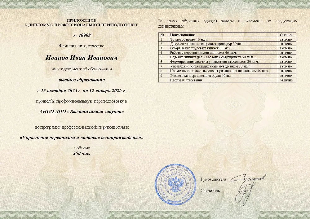 Программа профессиональной переподготовки (250 ак. часов) включает 19 модулей: трудовое законодательство и кадровое делопроизводство, подбор, мотивация и оценка персонала, психология менеджмента и разрешение конфликтов, автоматизация документооборота и работа с персональными данными. Обучение онлайн, доступно по всей России, в том числе в в Белгороде. Итоговая аттестация — тестирование до 10 вопросов без ограничения времени и числа попыток (99% сдают с первого раза); рефераты и дипломные работы не требуются. Диплом выдаётся за 1 день, запись в ФРДО — в день выдачи. Мониторинг рынка подтверждает: это самый дешёвый курс среди аналогов.