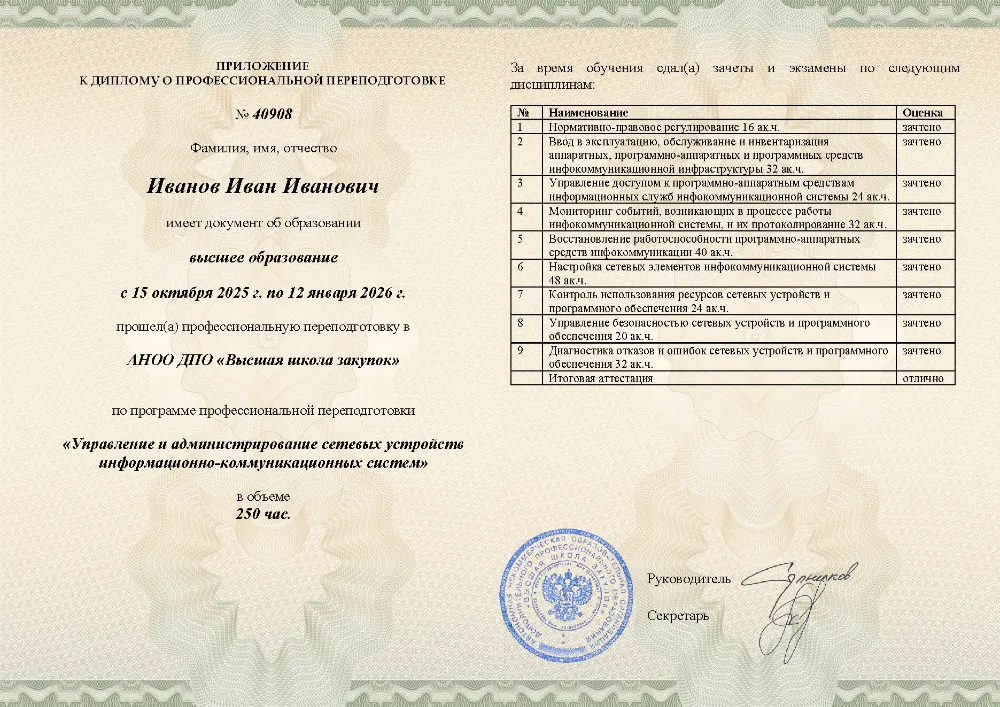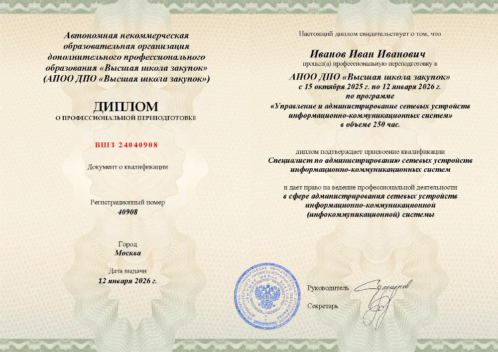 Профессиональная переподготовка, 250 академических часов, 9 модулей: нормативно-правовое регулирование и ввод в эксплуатацию, настройка и мониторинг сетевых устройств, управление доступом и безопасностью, диагностика и восстановление работоспособности инфокоммуникационных систем. Онлайн-обучение в в Белгороде с итоговой аттестацией.