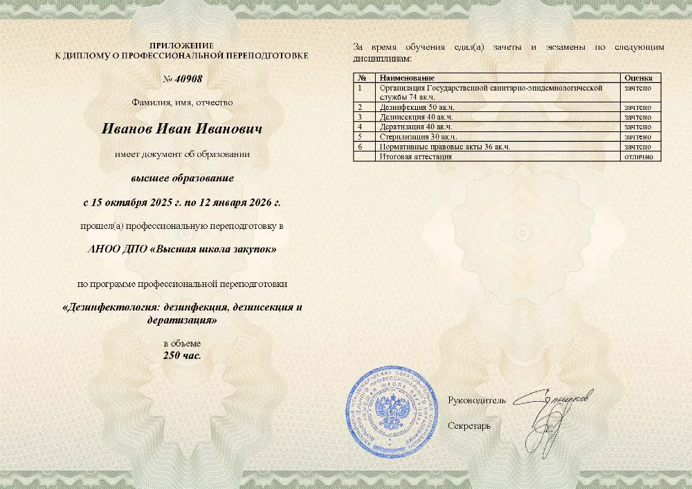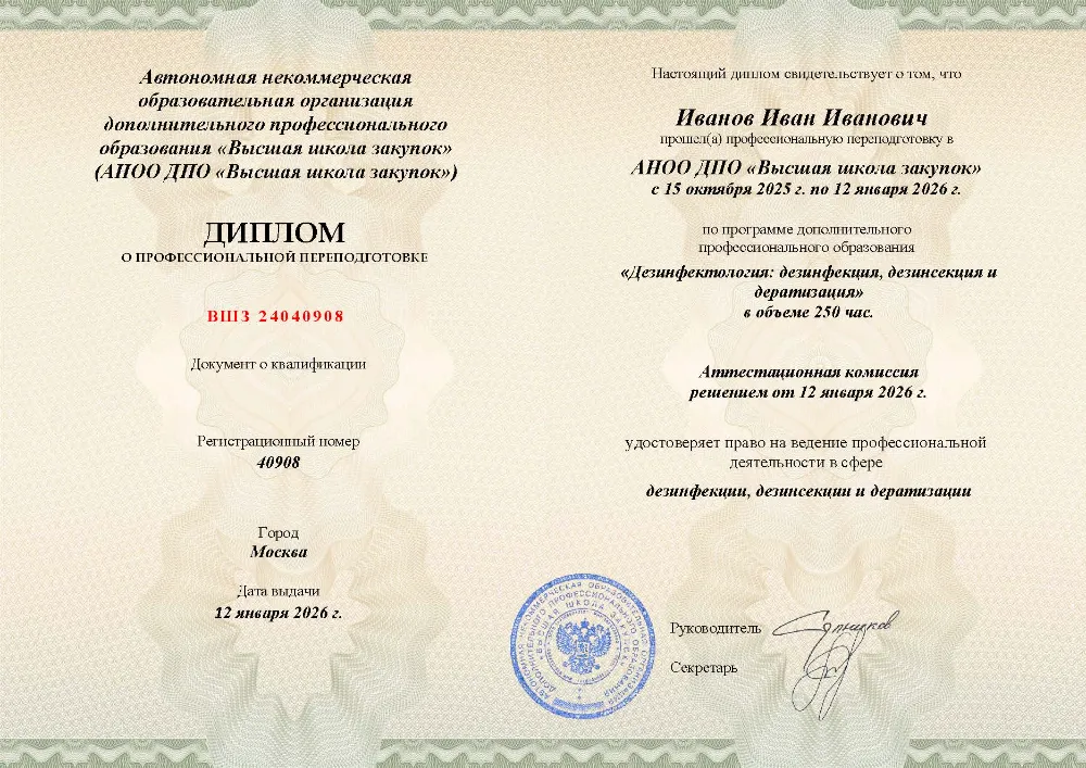 Курс профессиональной переподготовки объемом 250 академических часов разработан для сотрудников санитарно-эпидемиологических служб, дезинфекционных станций и профильных организаций. Обучение проходит дистанционно в Белгороде. Программа включает изучение основ работы санитарных служб, методов стерилизации и всех направлений обеззараживания: дезинфекции, борьбы с насекомыми (дезинсекции) и грызунами (дератизации). Учебный план имеет практическую направленность и охватывает актуальные правовые нормы. Аттестация максимально упрощена: онлайн-тест до 10 вопросов без лимита времени и количества попыток (99% слушателей справляются с первого раза). Никаких рефератов и защит работ. Мониторинг рынка подтверждает, что это наиболее бюджетный вариант обучения в своем сегменте. Диплом оформляется за 1 день, сведения в реестр ФРДО заносятся непосредственно в день выдачи.