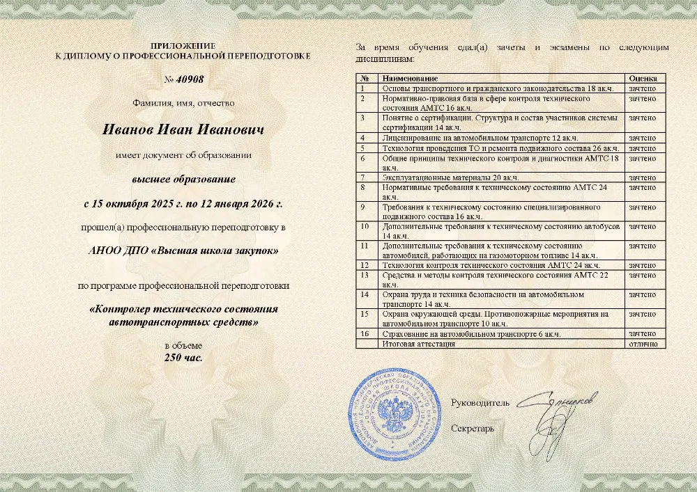 Программа профессиональной переподготовки, включающая 250 академических часов материала, предназначена для специалистов, ответственных за предрейсовый и технический осмотр автотранспорта. Заниматься можно полностью удаленно в Белгороде, совмещая учебу с основной деятельностью. Курс охватывает нормативную базу работы контролера, современные технологии диагностики, требования к безопасности транспортных средств, а также нормы охраны труда и экологии. Проверка знаний организована в формате несложного тестирования (до 10 вопросов) без ограничений по времени и количеству попыток, поэтому 99% обучающихся сдают всё с первого раза. Подготовка рефератов и защита работ не требуются. Сравнительный анализ цен доказывает: это самый бюджетный вариант обучения в своем сегменте. Диплом выдается за 1 день, а запись в ФРДО появляется сразу в день выдачи документа.