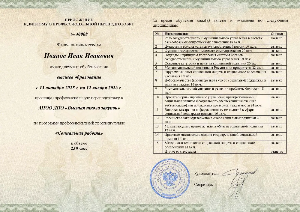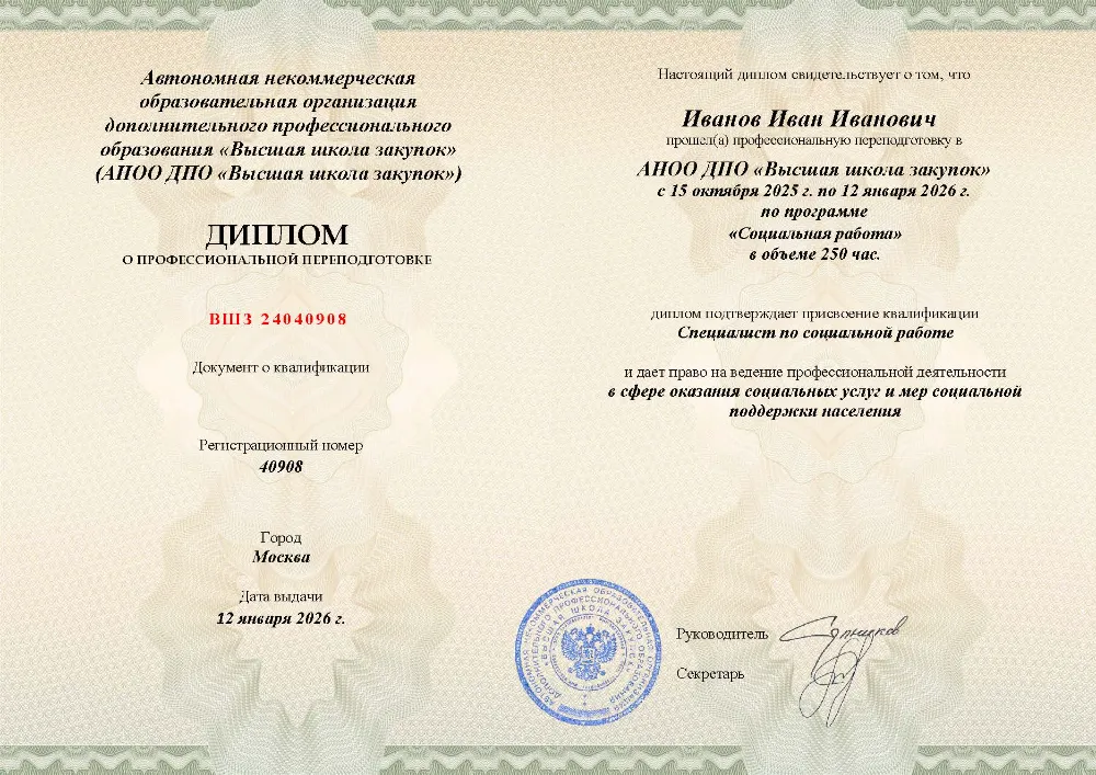 Программа профессиональной переподготовки (500 академических часов) направлена на углублённое изучение государственного управления в социальной сфере, моделей социальной политики, правовых механизмов предоставления услуг, проектного управления и внедрения IT-решений. Обучение проходит дистанционно, доступно жителям всех регионов России, включая в Белгороде. Итоговая аттестация — тестирование из 10 вопросов без ограничения по времени и с неограниченным числом попыток (99% слушателей справляются с первого раза); написание рефератов и дипломных работ не требуется. Диплом выдаётся за 1 день, сведения о нём вносятся в ФРДО в день выдачи документа. Мониторинг рынка подтверждает: это самый дешёвый курс среди предложений профессиональной переподготовки по данному профилю.