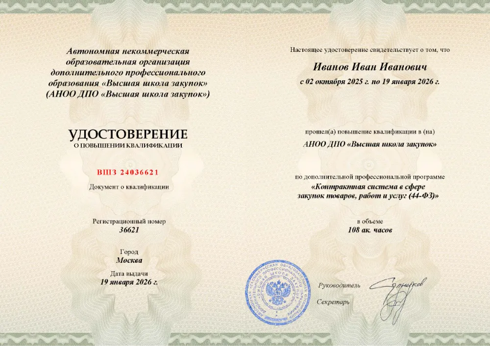 Курс повышения квалификации, содержащий 120 академических часов обучения, разработан специально для юристов, осуществляющих правовое сопровождение закупочной деятельности. Обучение организовано в дистанционном формате в Белгороде. Программа детально разбирает принципы работы по 44-ФЗ и 223-ФЗ, механизмы взаимодействия участников торгов, способы выбора поставщиков, а также систему контроля и юридической ответственности в сфере госзакупок. Аттестация максимально упрощена: онлайн-тест до 10 вопросов без ограничений по времени и количеству попыток (99% слушателей справляются с первого раза). Никаких рефератов и защит работ. Анализ рынка подтверждает: это самое выгодное ценовое предложение в данном сегменте. Удостоверение оформляется за 1 день, а сведения в ФРДО вносятся непосредственно в день выдачи.